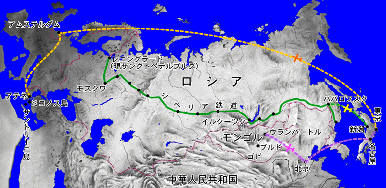 | 東京 | ⇒ | 新潟 | ⇒ | ハバロフスク | ⇒ | イルクーツク | ⇒ | モスクワ | ⇒ | レニングラード | ⇒ | ハバロフスク | ⇒ | 新潟 | ⇒ | 東京 |